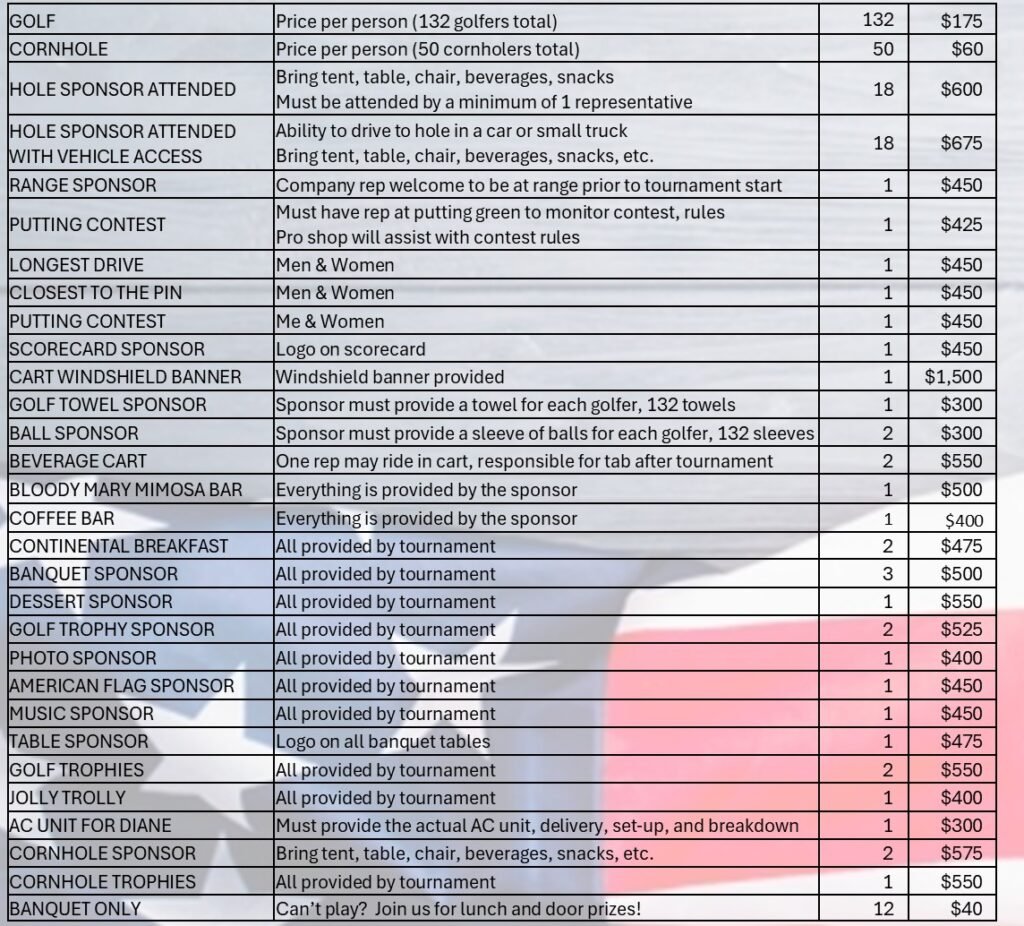 Sponsorship and Registration Item List